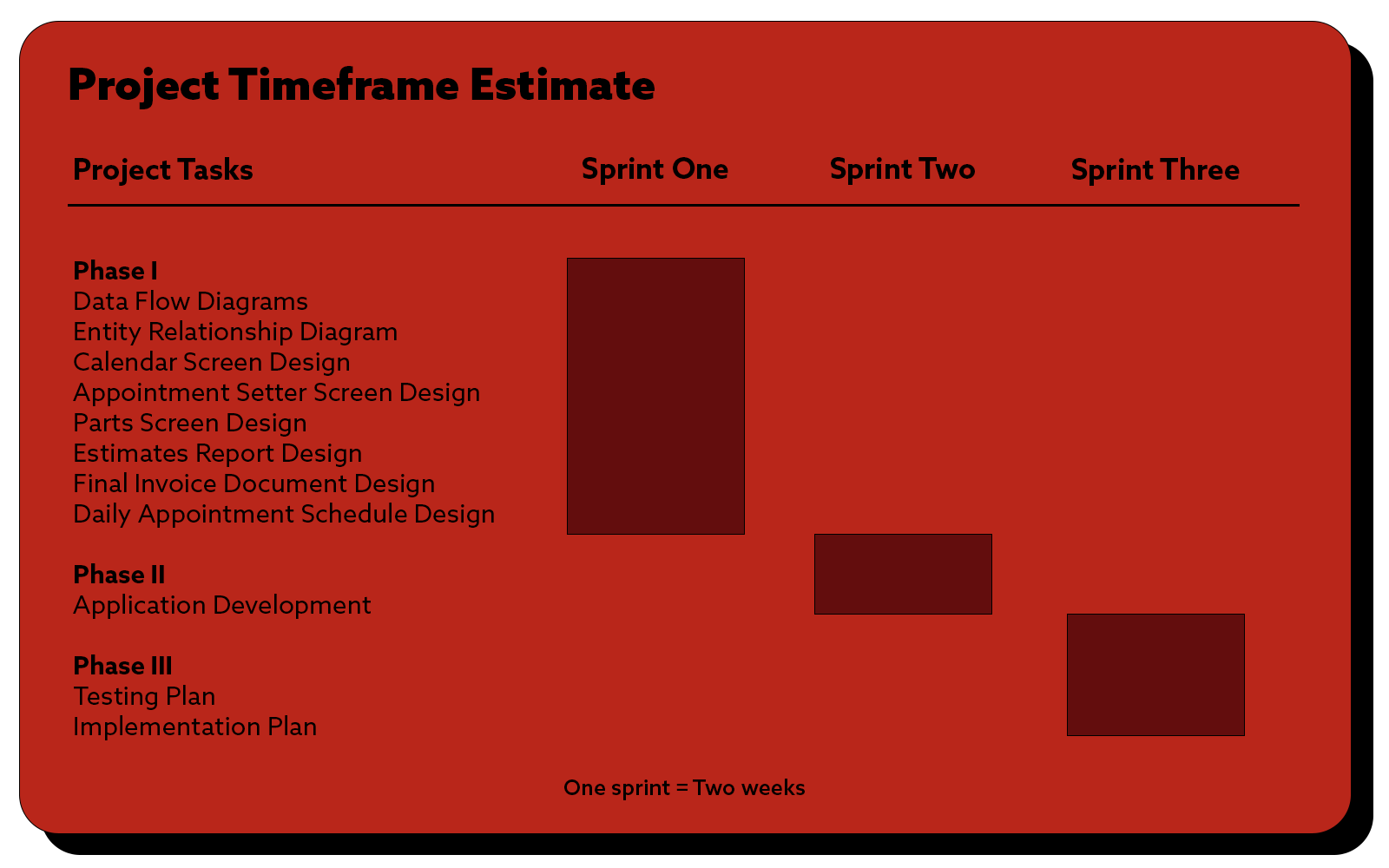 The information gathered from the SWOT analysis and department interview questions provided a foundation for me to discern the requirements of the new service system, as well as the tasks involved in its development. Next, I developed a timeline mapping out an estimate of how long each phase of the project would take.
