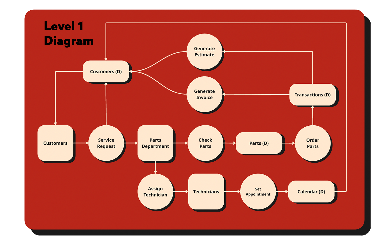 To better communicate the processes and capabilities of the service system I developed a comprehensive breakdown including data flow and entity relationship diagrams illustrating the system’s functional architecture, and a decision tree mapping key escalation points based on customer characteristics.